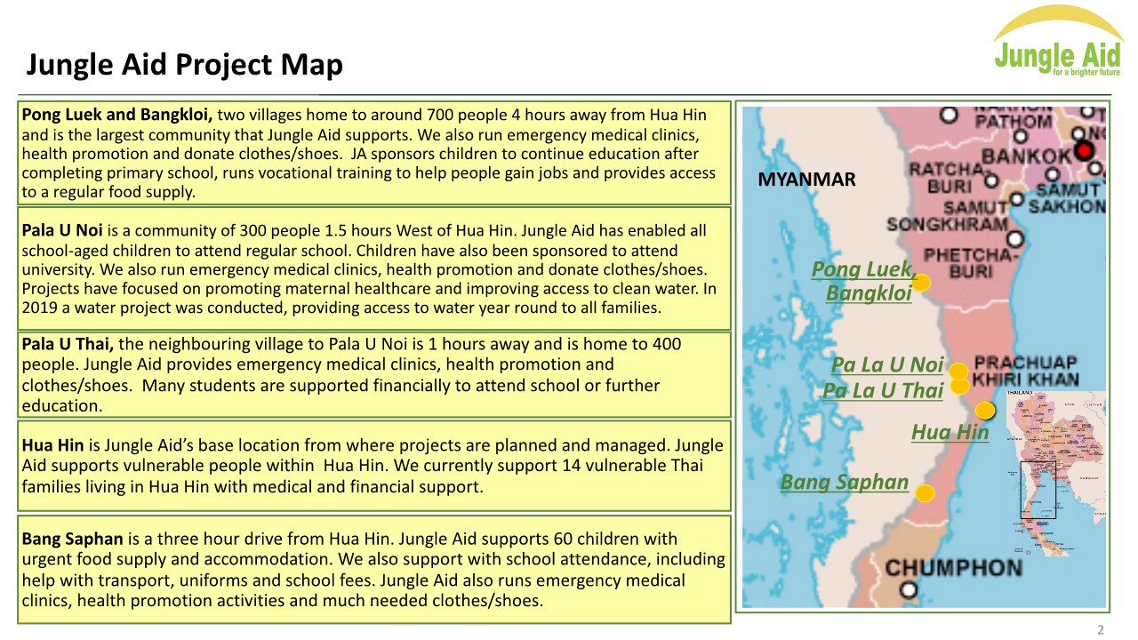 The Jungle Aid Foundation supports disadvantaged refugees and Thai families living near or in Hua Hin and helps with medical support, education costs, and access to food and water. For people in developing communities, aid can change everything.